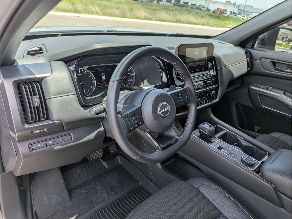 The state of the art park assist system will guide you easily into any spot. An off-road package is equipped on this mid-size suv. This vehicle keeps you comfortable with Auto Climate. The vehicle offers Apple CarPlay for seamless connectivity. See what's behind you with the back up camera on this Nissan Pathfinder. The leather seats in this 2024 Nissan Pathfinder are a must for buyers looking for comfort, durability, and style. Bluetooth technology is built into it, keeping your hands on the steering wheel and your focus on the road. This vehicle comes equipped with Android Auto for seamless smartphone integration on the road. This vehicle has a V6, 3.5L high output engine. Maintaining a stable interior temperature in this model is easy with the climate control system. This model has an elegant black exterior finish. This vehicle has four wheel drive capabilities. Electronic Stability Control is one of many advanced safety features on it.